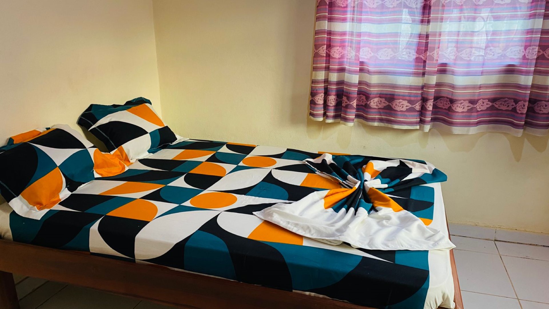 - 1 chambre avec un lit trois places, ouverte sur WC et salle de bain