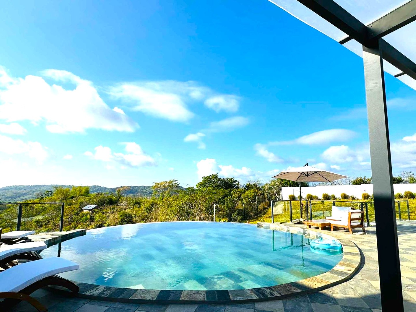 -1 terrasse avec piscine à débordement et coin barbecue