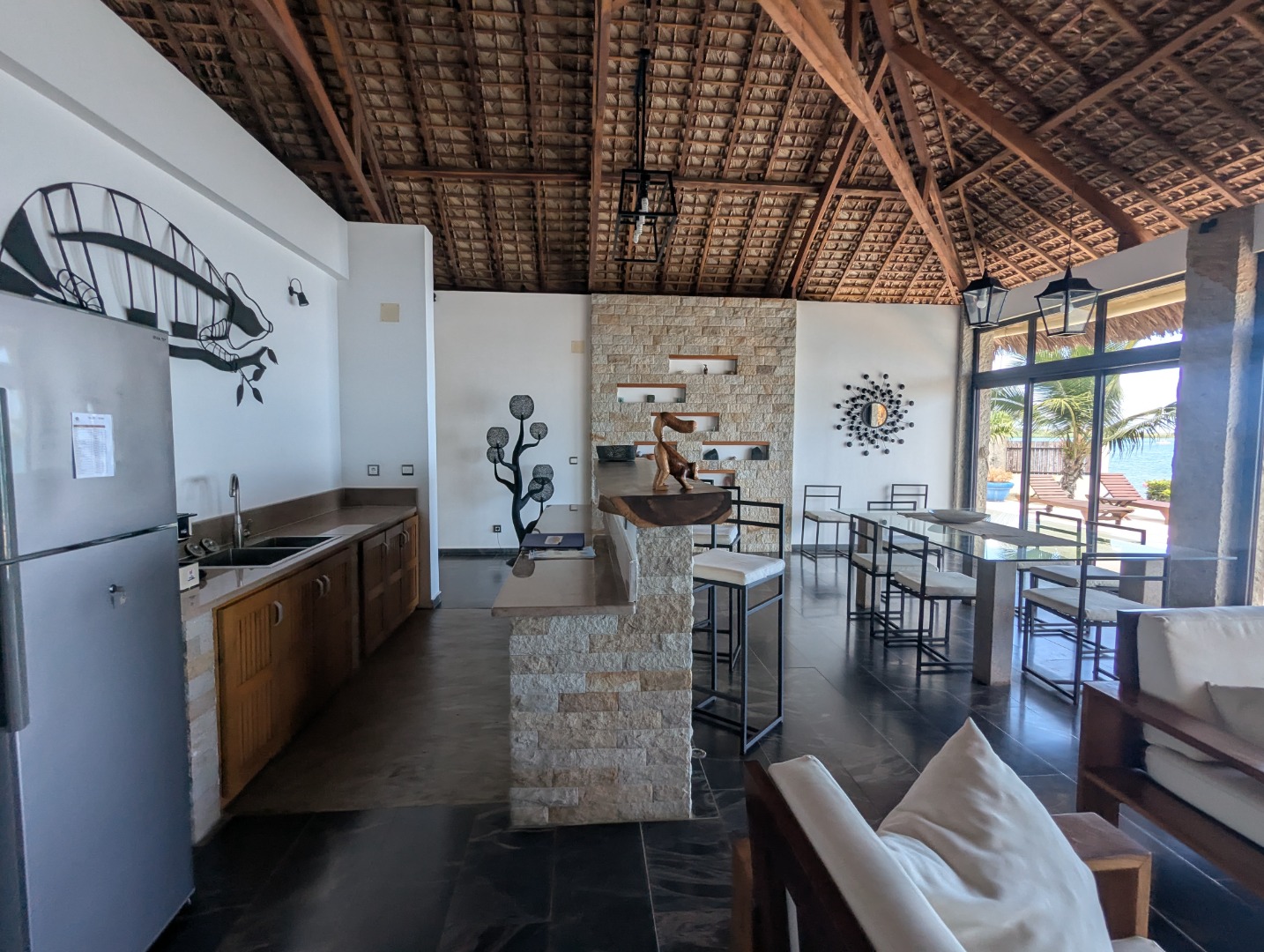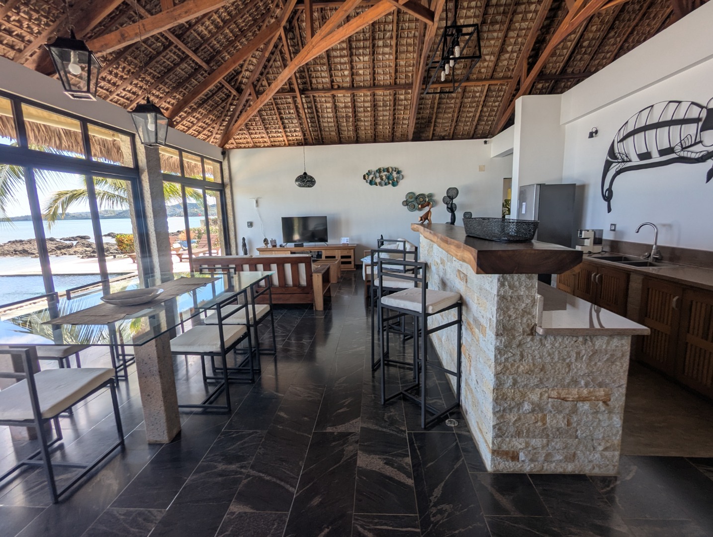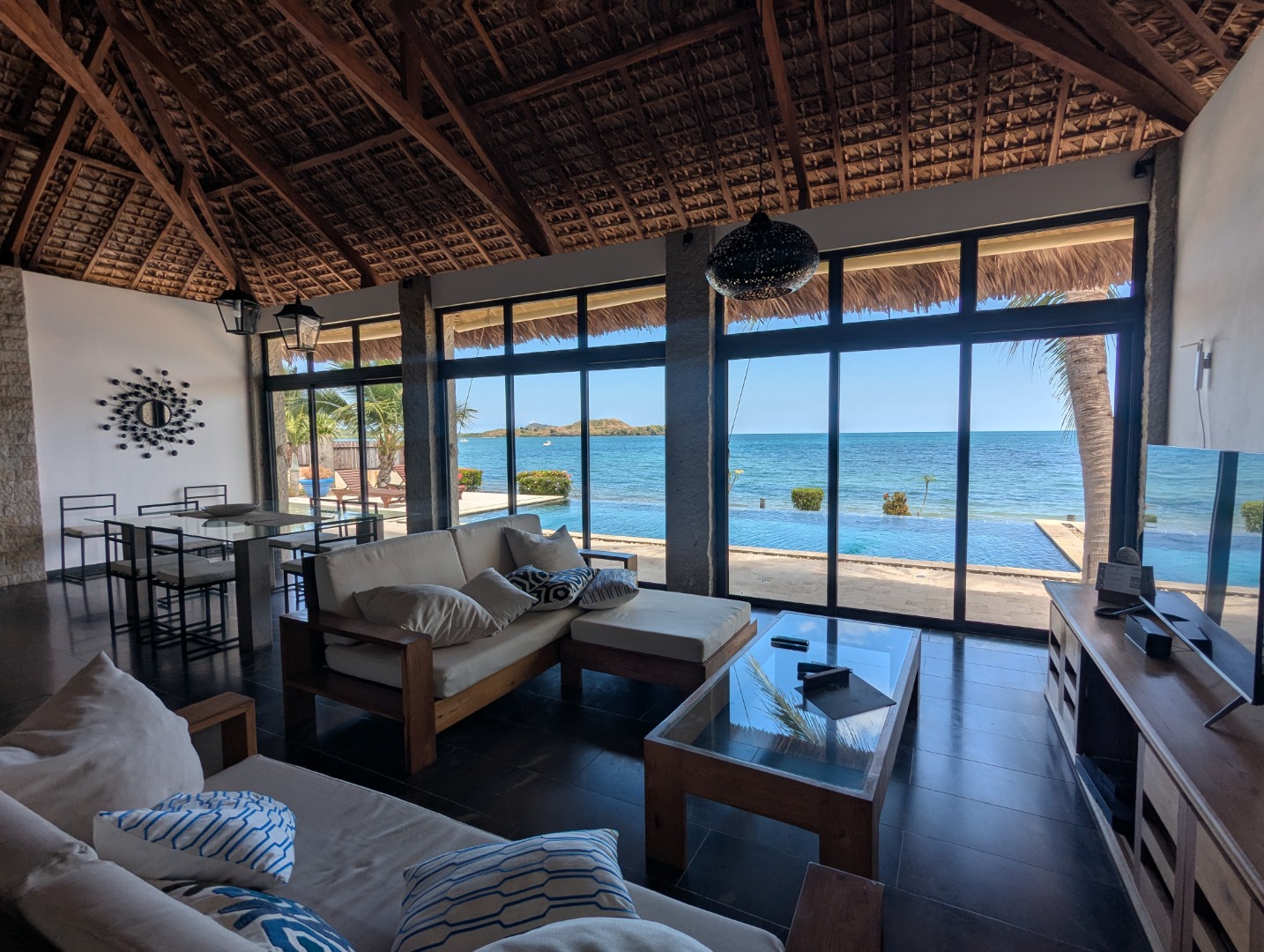 - 1 grand séjour offrant une vue sur la plage et piscine avec cuisine ouverte.
