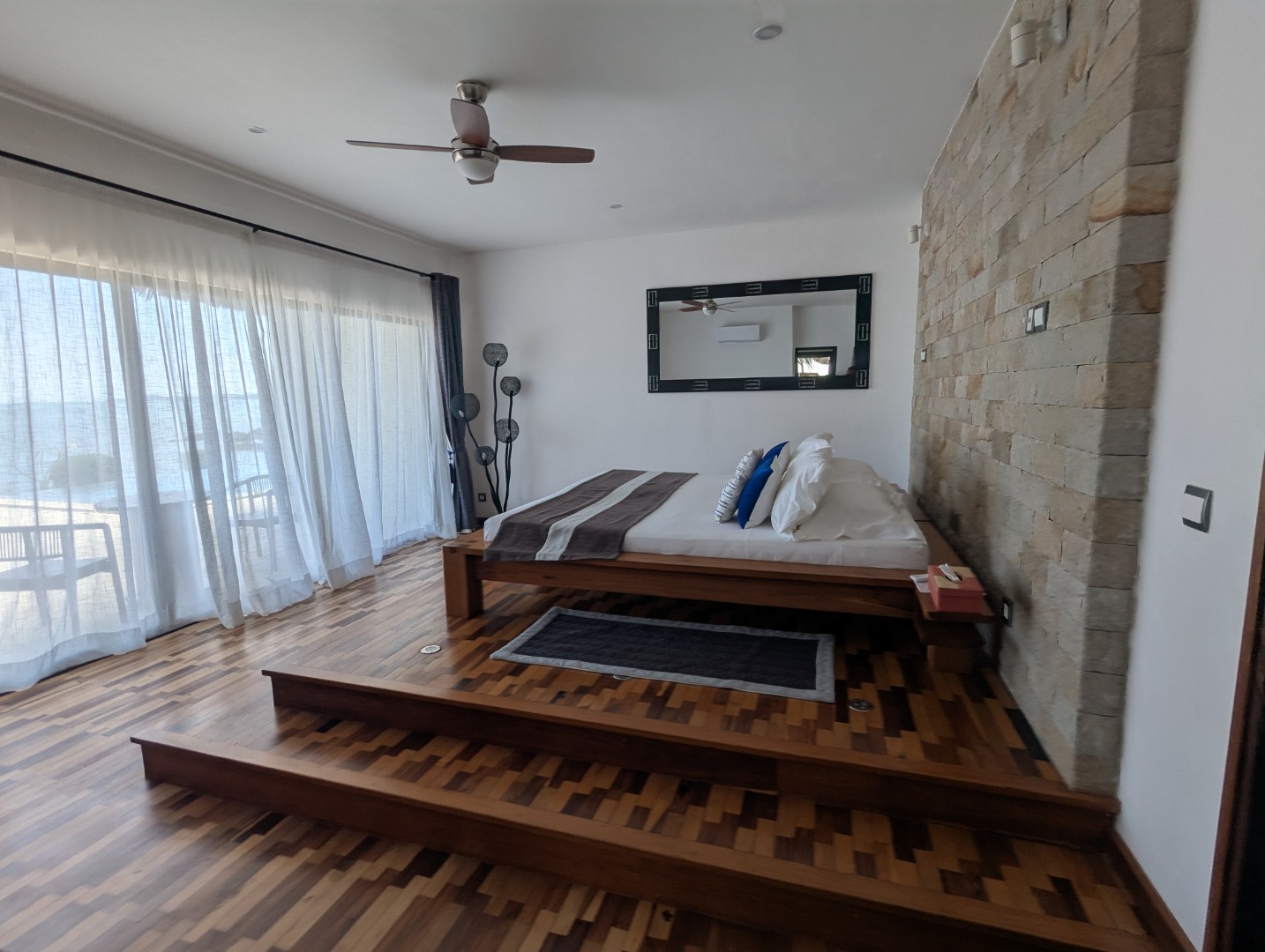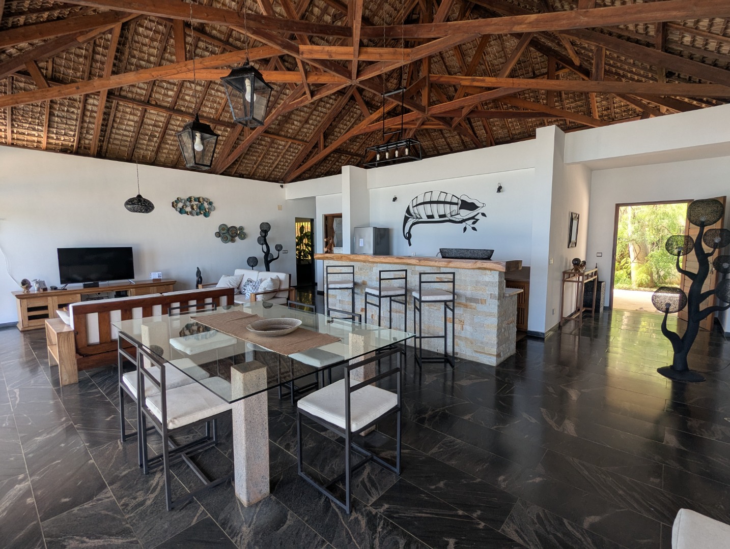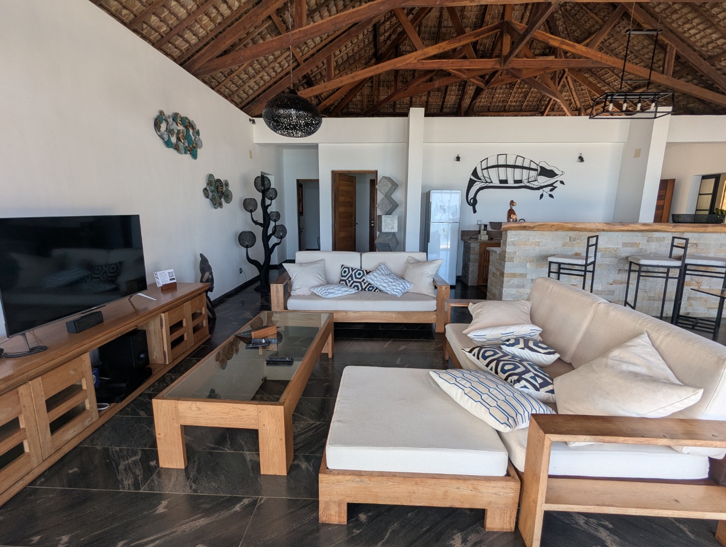 - 1 grand séjour offrant une vue sur la plage et piscine avec cuisine ouverte.