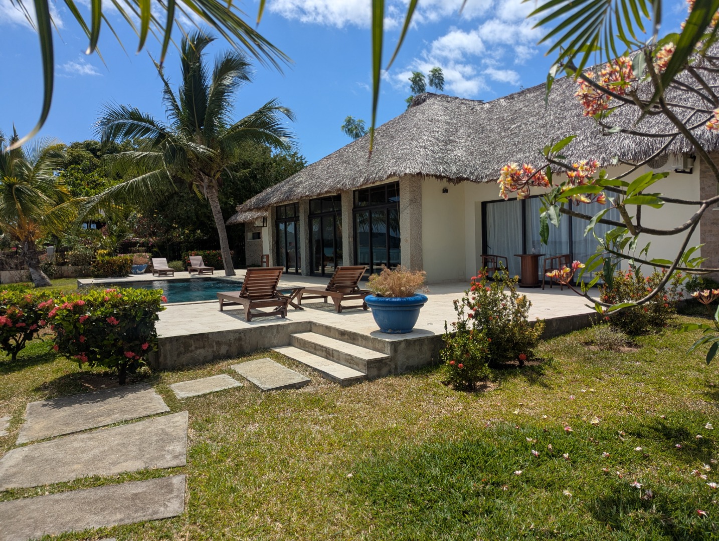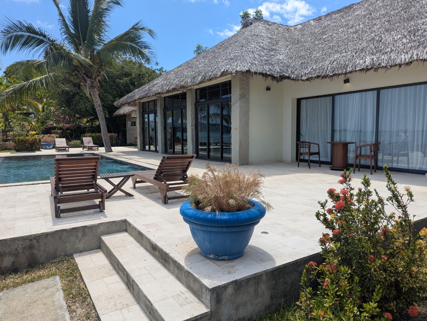 - Jardin arboré et fleuri : cocotiers, palmiers, cactus, etc.